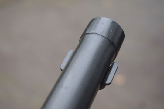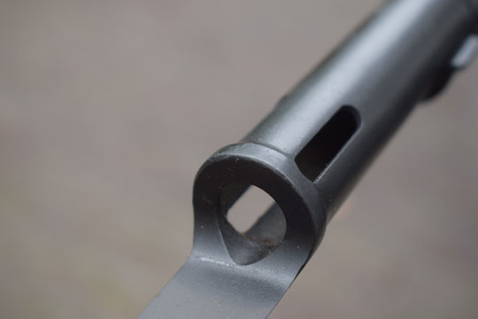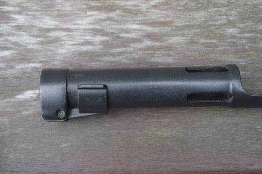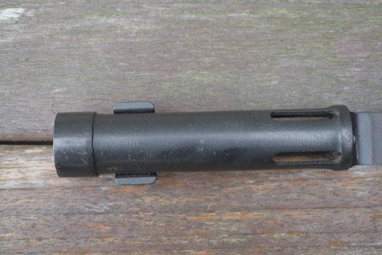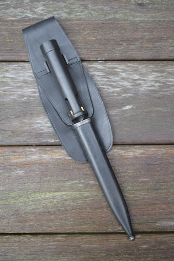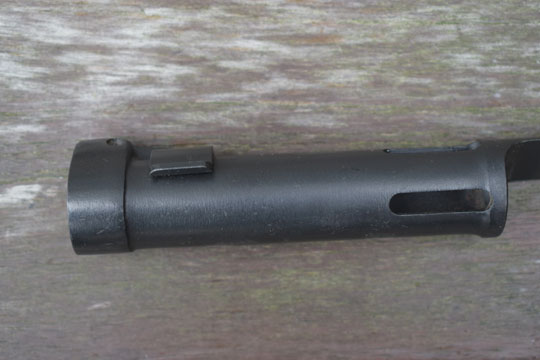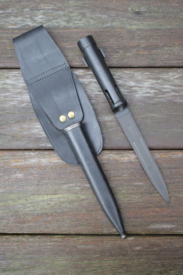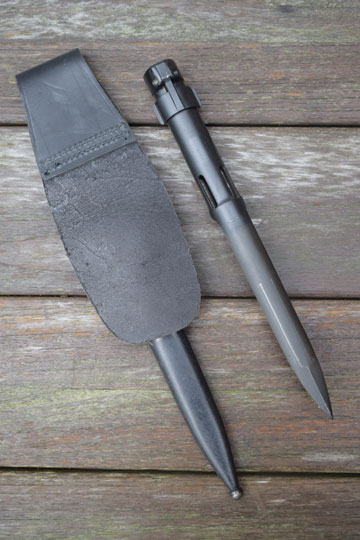 FN FAL cal. 7,62 mm NATO automatic rifle. Excellent+ blade with a flat upperside and a round underside. Minty blackened long cylindrical socket. The cylindrical socked has four slotted openings and a press catch with smooth "wings". The minty blackened metal full dress scabbard has an unique large black leather frog fixed to the scabbard with two bright polished brass rivets. Scabbard is marked with a capitel Z.