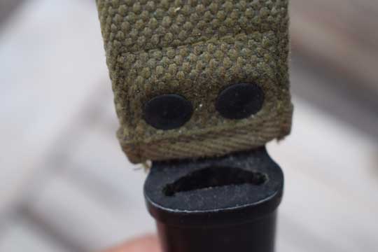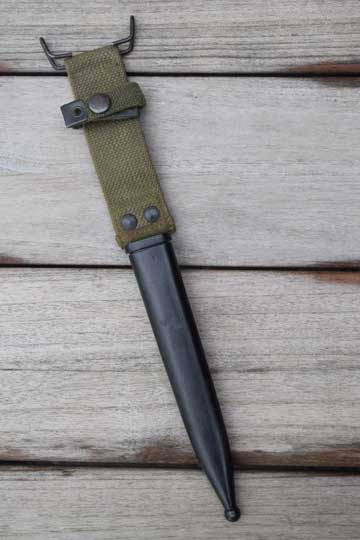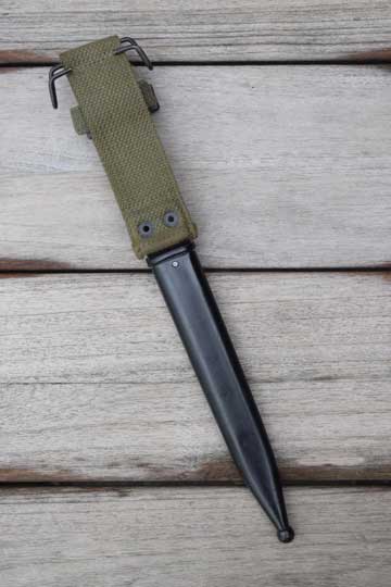FN FAL and CAL. automatic rifle 7.62 mm NATO. No serial number. Excellent - dark blued steel scabbard only. Streel throat. Integral green khaki webbing with a brass US belt hook and a retaining strap. No dents to the scabbard.