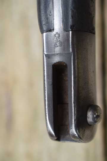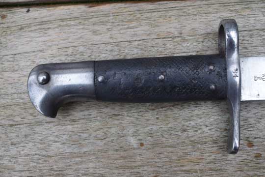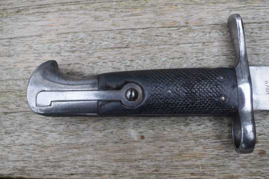 English Snider Artillery carbine MKIII. Serial number: 84 on crossguard. English M 1875 trials bayonet for New Zealand. Excellent + bright finished saw back blade with a long false edge. Ricasso is dated with the convertion date: 9 /'80 and the reverse side is marked with an Enfield inspection marking /I\ over WD over Crown over E over 59. Excellent bright finished pommel and a crossguard with a spoon shaped quillon and a muzzle ring MRD 2.0. Short mortise slot marked Crown over E over 59. External leaf spring on the left side of the hilt. Excellent checkered black leather grips fixed to the blade tang by 4 steel rivets. Grips show some light wear to the checkering only.