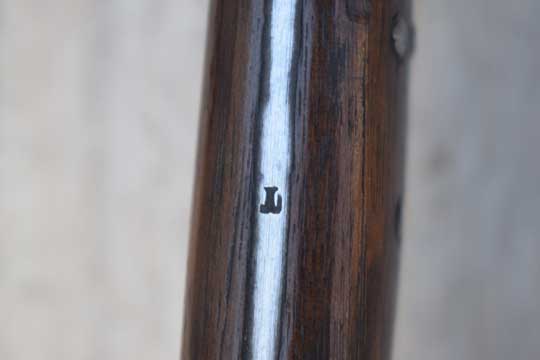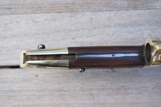Lund chamber loader rifle M 1860 and M 1867 Remington rolling block rifle. Serial number:31180 on ricasso. Excellent+ bright finished long fullered yatagan blade with serial number on the ricasso and Crown over K (=Kongsberg Arsenal) and an inspection markings; Crown over Gothic sign on the reverse side. Blade tang is marked with a capital L mark. Beautiful brass T- slotted pommel with lanyard hole in top. Brass crossguard with swept forward quillon and muzzle ring with cock comb; MRD 18,5 mm. Excellent dark brown wooden grips, pinned to the blade tang by four rivets.
