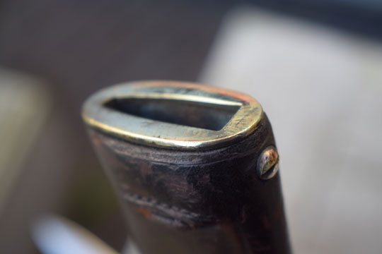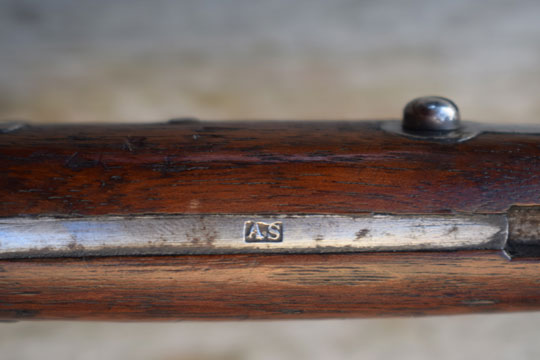 Excellent brass pommel with a T-slot and a short external spring. Blade tang is marked: AS in a box. Lanyard hole in top. Brass crossguard with swept forward quillon and muzzle ring with cock comb; MRD 18,5 mm. Excellent+ wooden grips, pinned to the blade tang by four rivets.