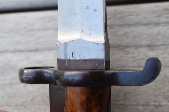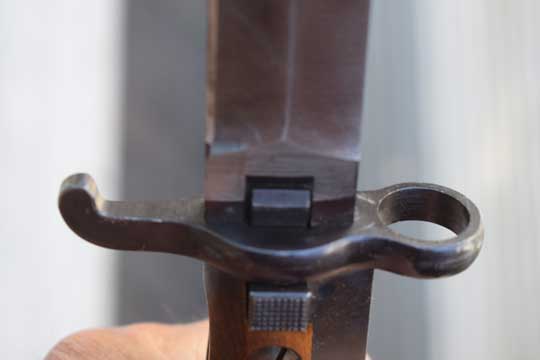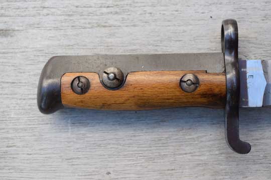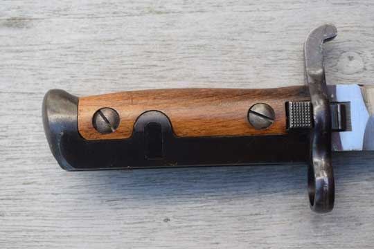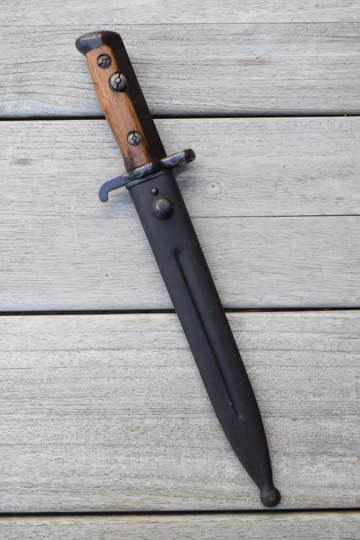 Norwegian M 1894 Krag-Jorgenson rifle. Serial number: 1734 on the ricasso. Minty symmetrical bright finished double edged blade with Swedish makers name: E. A. B (=Erik Anton Bergs, Fabriksaktiebolag, Eskilstuna ) on the ricasso. First 3 mm are blackened. Blued steel hilt with wood grips, secured to the blade tang by steel bolts. Blued crossguard with muzzle ring MRD 17.7 mm and quillon with forward swept finial. A press catch on the left side of the grip, above the crossguard to keep the bayonet in position. T-O slot in pommel.  Matt black finished steel scabbard with a small circular frog stud and a finial. Central groove on both sides of the scabbard.