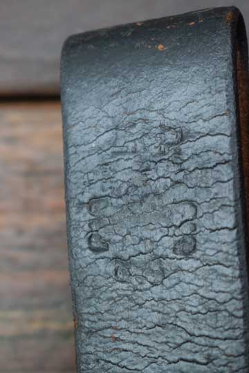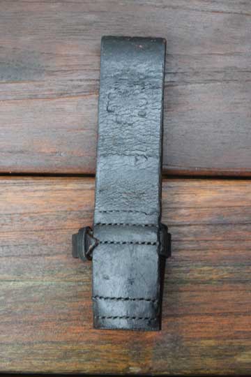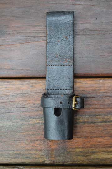 Portuguese Infantry bayonet frog for the M 1886 Kropatcheck / M 1904 Mauser Verguero rifle. Excellent black leather bayonet frog with a retaining strap with a brass buckle and roller. Reverse side is crisp marked: L.P. over a large crossmark. (Ref. Anthony carter AC 382)