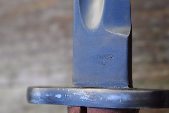 Mauser Verguero M1904 rifle. No serial number. Minty dark blued fullered blade with German maker's name; SIMSON & Co - SUHL crisp and in two lines on ricasso. Lower blade spine shows small inspection markings. Blued pommel with T-O slot and crossguard. Blued crossguard with muzzle ring MRD 15,5 mm. Excellent wooden grips secured to the blade tang by screw bolts.