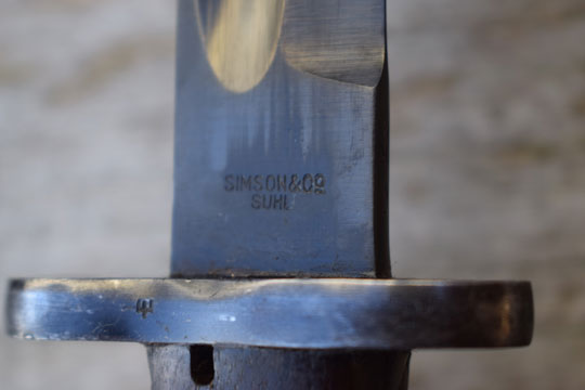 Mauser Verguero M1904 rifle. Serial number: A 9465 on the right side of the pommel. Minty dark blued fullered blade with German maker's name; SIMSON & Co - SUHL crisp and in two lines on ricasso. Lower blade spine shows small inspection markings: R R 6. Excellent blued pommel with T-O slot and crossguard. Blued crossguard with muzzle ring MRD 15,5 mm. Excellent+ wooden grips secured to the blade tang by screw bolts.