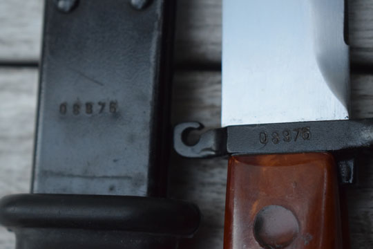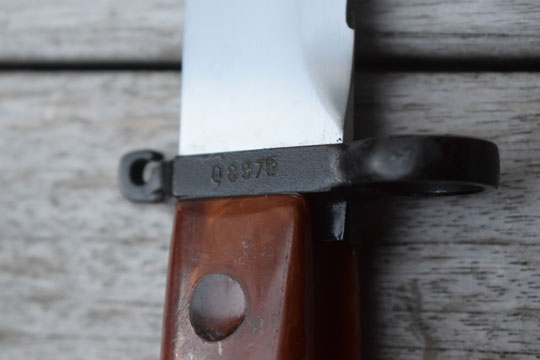 Kalashnikov AKM and Dragunov SVD automatic rifle. Russian bayonet model AKMI (1959) for Poland. Serial number: 08976 on the crossguard. Matching. Minty bright finished finished reversed Bowie style blade with a hole for the wire cutter system. No sawback. Orange plastic hilt with large rounded pommel and crossguard with muzzle ring MRD 17,5 mm. Black painted steel scabbard with wire cutter system and black rubber insulator. Matching serial number: 08976 on the steel scabbard body. Brown leather frog with brown leather retaining strap.