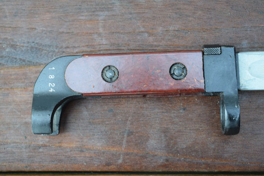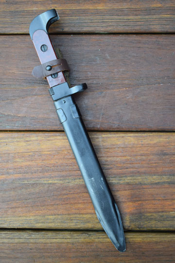 Russian M 1947 Kalashnikov rifle. Kal. 7,62 Russian. AK47 6x2 (6hz) Type 1 M 1951 bayonet. Serial number: 1824 on the pommel. Minty double edged parkerized blade with central fuller. Dark blued pommel and crossguard with muzzle ring MRD 17,5 mm. Reddish brown grips fitted to the blade tang by screw bolts. Dark blued metal scabbard with a green webbing belt loop and a brown leather retaining strap. No dents to the scabbard.