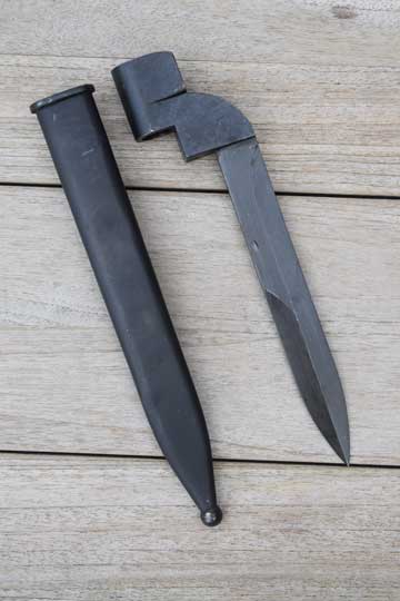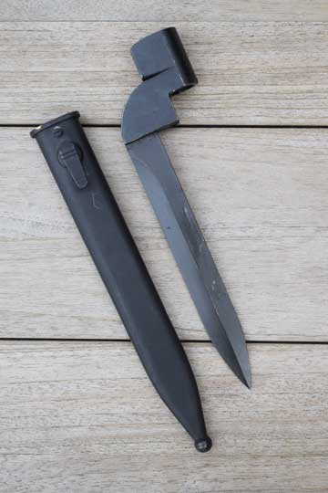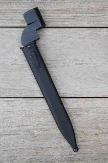 Rifle 303 no.4. No serial number. Minty straight dark parkerized non-fullered UZI type blade with large false edge, riveted by two rivets to the socket. Excellent dark blued socket. Excellent and correct blackened steel FN FAL scabbard with no dents.