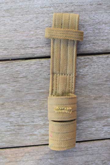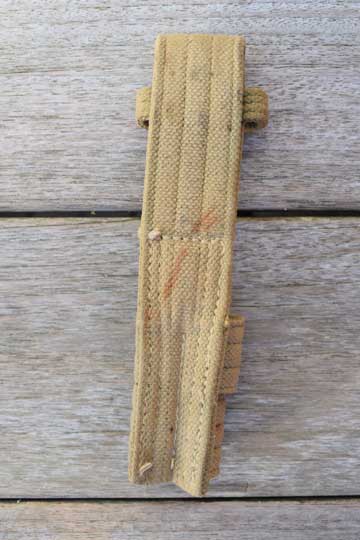 An Excellent P 1937 khaki frog, made in South Africa. This is a very scarce South African quilted frog for the P 07 bayonet and the No.4, made of double thickness webbing stitched together. Two front loops. Top one with eyelet for No.4 bayonet. (Ref. Antony Carter AC 157). No markings.