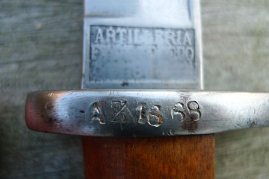 Mauser M 1893 kal. 7mm 5 shots. s# AZ 1668 on crossguard. Excellent bright fullered blade with ARTILLERIA, FABRICA de TOLEDO, and 18? in three lines in a box on ricasso. Excellent bright polished pommel and thick crossguard with muzzle ring MRD 15.5 mm, Crossguard is marked 23 facing the blade. Straight back hilt with wooden grips secured to the tang by screws. Excellent black leather scabbard with clear tools and bright fittings with no dents. Serial number 0296 on top mount.