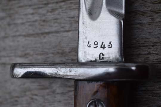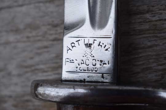 Spanish Mauser rifles and carbines: M 1893 Mauser rifle, M 1916 Artillery carbine and M 1943 Mauser rifle with adapter. Serial number: 4943 over C on the ricasso. Excellent long bright finished fullered blade with serial number on the ricasso and ARTILLERIA - Crossed cannons- Fca, NATIONAL over TOLEDO in three lines on the reverse side. (Used from 1920 -1936) Excellent bright finished pommel and crossguard with muzzle ring MRD 15,5 mm. Perfect smooth wooden grips screwed to the blade tang.