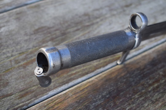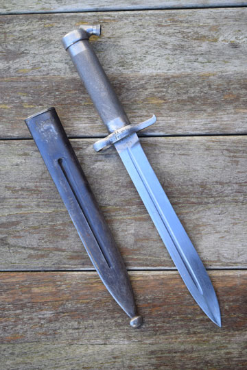 Swedish Mauser M 1896 6.5 mm. / M 1935 short rifle and AG42b Ljungmann self loading rifle, Serial number: 3232 on the ricasso. Excellent bright finished blade with a narrow central fuller marked with Swedish maker's trademark: E J- Crown E over anchor- AB. (= Eskiltuna Jernmanufaktuakiebolag AB) and the serial number 3232 on the ricasso. Reverse site is marked with a Crown. Excellent one piece steel tubular checkered hilt with a cylindrical press catch fitted to the pommel of the hilt. Crossguard with a short backwards swept quillon and a muzzle a ring: MRD 15.5 mm. Crossguard is matching Regimental marked: 12 over 122. (= 12th. Regiment Landstormen)No.36. A small Crown on the quillon. Facing the blade the crossguard is marked with another matching serial number: 3232 and another makers mark: EJ-Crown E over anchor- AB.