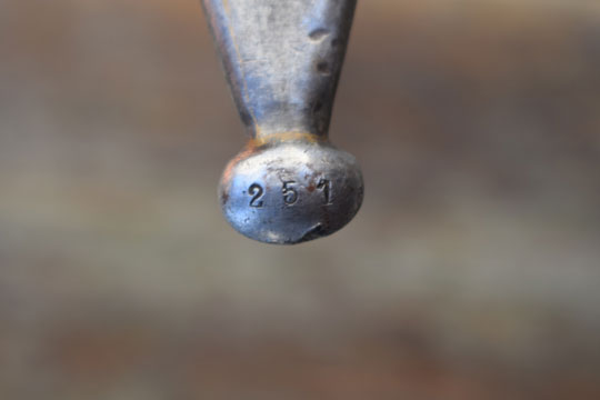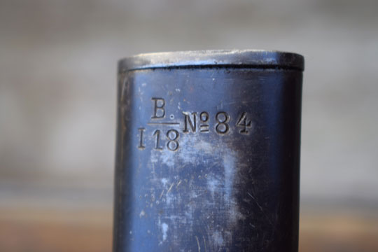 Excellent all blued steel scabbard, free of dents, crisp matching Regimental marked: B over 118. No.32 a and No.84. Finial is marked with the serial number: 251 and there is a Crown on the reverse side. Scabbard throat is marked with the serial number: 251 and and again a EJ- Crown over anchor-AB marking.
