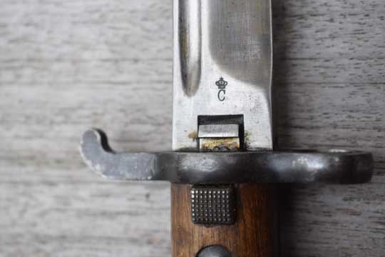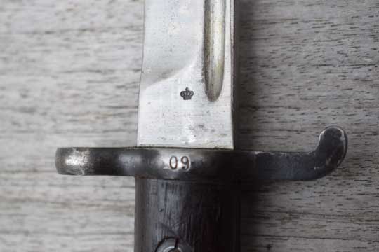 Swedish Mauser Naval carbine M 94-14. Serial number: 60 on the crossguard. Superb bright finished very long blade with a very narrow fuller. Blade edge is cutting up. Ricasso is marked with the Swedish maker trademark: Crown over C (= Carl Gustavs Stads, Gevärsfaktori-Eskiltuna) and another Crown inspection mark on the reverse side. Perfect blued pommel and crossguard. Crossguard with a muzzle ring, MRD 15,9 mm. and a small forward swept quillon. T-slot in pommel Catch is marked with a Swedish inspection marking. Wooden grips are fixed to the blade tang by the screw bolts. A locking device with a square push button, keeps the bayonet in its steel scabbard.