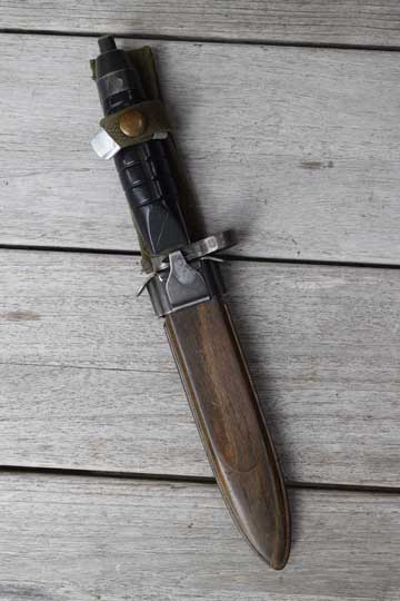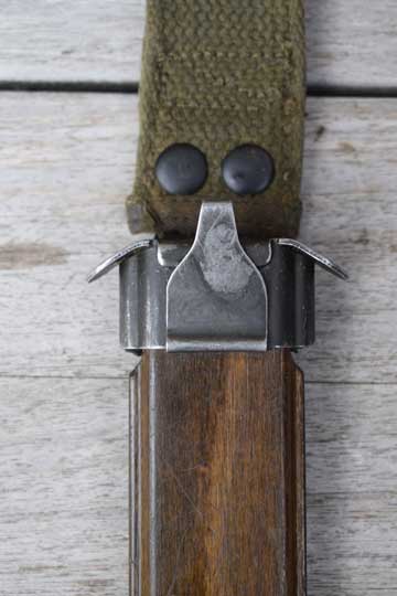 Excellent first pattern wood-grain plastic scabbard body with the bayonet retaining spring attached to the surface of the throat. Integrated green khaki webbing belt frog with retaining strap.