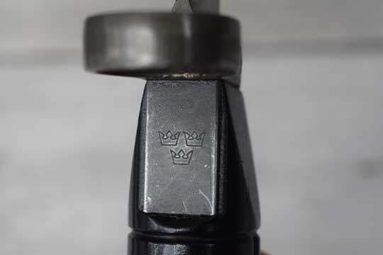 AK4 automatic rifle. No code number. Minty bright finished blade with a false edge. Blackened pommel and broad notched crossguard with muzzle ring. MRD 22 mm. Round 6 groove black plastic grips. Top of the hilt is marked with three Swedish crowns.