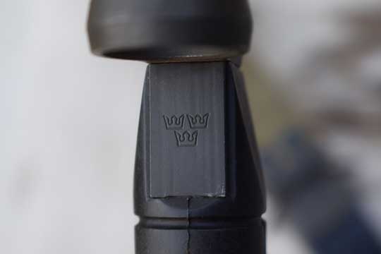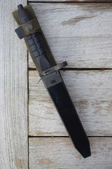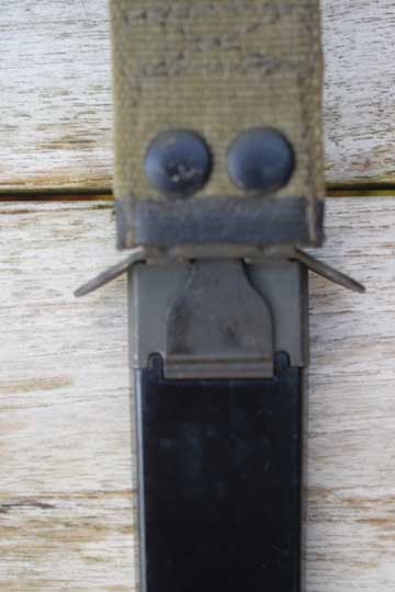AK4 automatic rifle. Code number: 593 75 001 on ricasso. Minty bright finished blade with false edge marked with the trade mark of the German company Carl Eichorn-Solingen: Sitting squirrel. Blackened pommel and a broad notched crossguard with muzzle ring. MRD 22 mm. Long round 7 groove black plastic grips. Catch on the right side. Top of the hilt is marked with three Swedish crowns. Second pattern black plastic scabbard body with the bayonet retaining spring attached to the surface of the back of the throat. Integrated green khaki webbing belt frog with retaining strap.