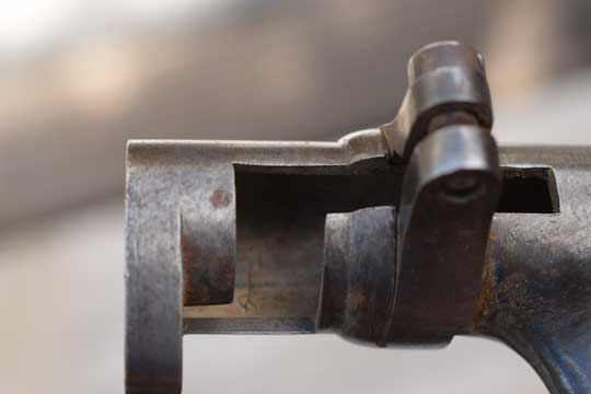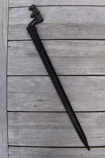 M1863-M1867-M1869 Ordonnance carbines and rifle and M 1867 Peabody rifle. No serial number. Excellent long blued cruciform blade, tapered to the tip. Z type mortise slot with locking ring. Locking ring is marked: 17 Shank is marked with a L in circle and W in a circle on the reverse side. MRD 18,7
