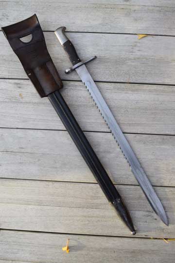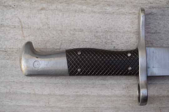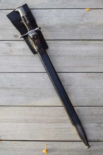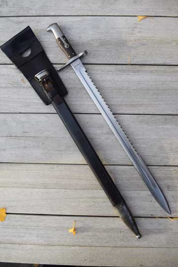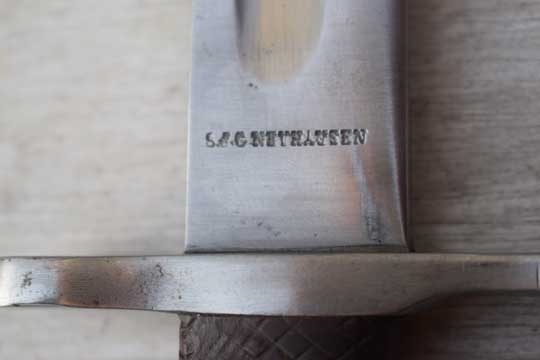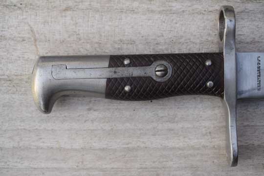 No rifle. No s.nr. Very good long bright 49 teeth sawback blade with fuller on one side. Maker's name; S.J.G. NEUHAUSEN in small digits on ricasso. Bright finished pommel and crossguard. Press stud is filed flush and mortise lock is filled with a wooden plug. Muzzle ring "horns" removed. MRD 18 mm. Excellent brown chequered grips riveted to tang with 4 rivets . Excellent and correct early model black leather scabbard marked 100 with bright metal fittings with all stitches intact. Comes with a dark brown leather frog with maker's name: F. WERTHMULLER - SATTLER- ALTERSWYL and date 1880 on the reverse side.
