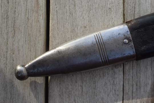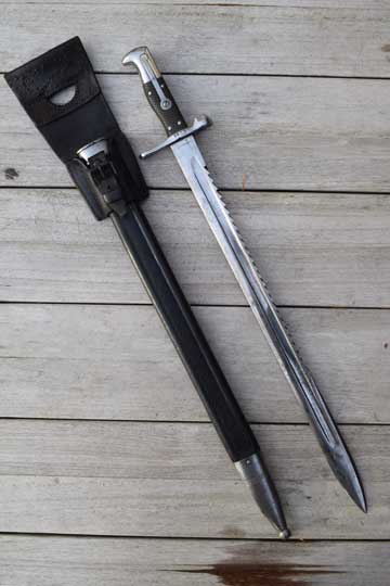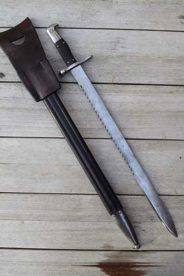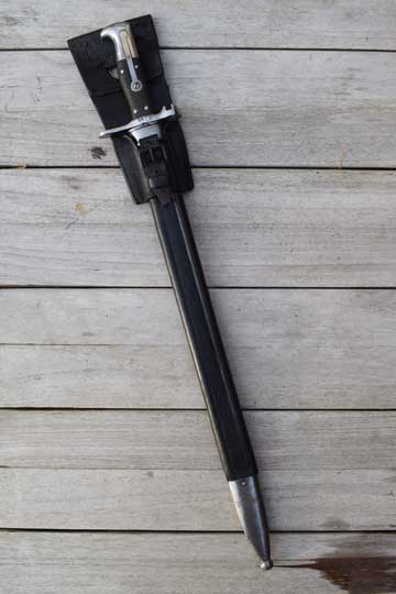 Rare unit marked Swiss M 1878 Pioneer bayonet converted to a side arm. Prob. for a NCO. Not a side arm made for musicians since it has "ears" on the muzzle ring