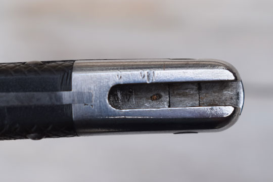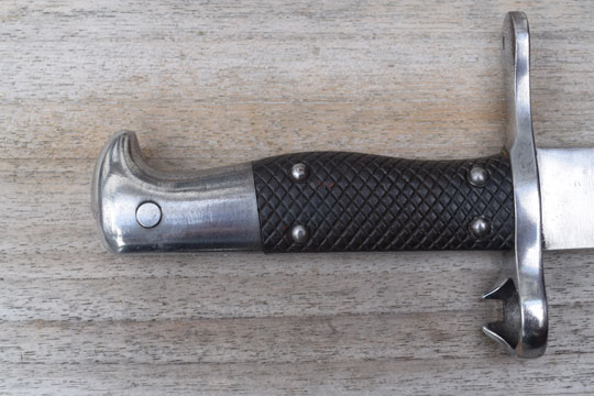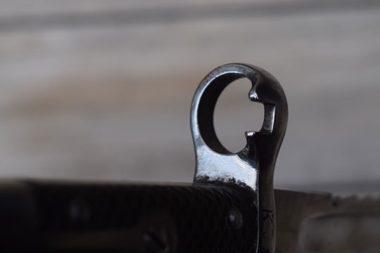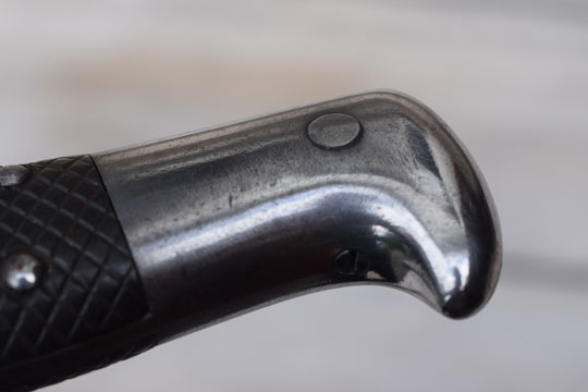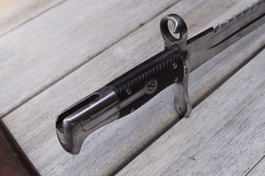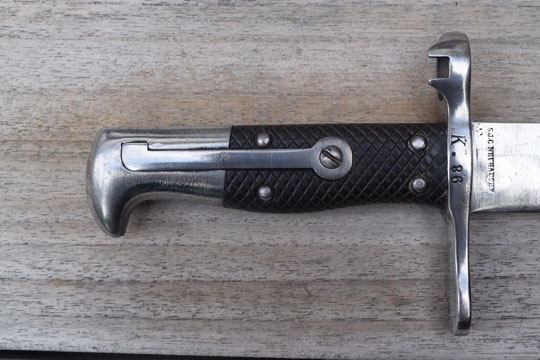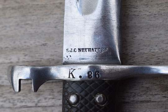 No rifle, M1878 bayonet converted to a side arm. No serial number. Very good long bright finished 49 sharp teeth sawback blade with fuller on one side only. The fullered side shows a couple of spots with very light pitting only. Swiss maker's name: S. J. G. NEUHAUSEN in small letters to the ricasso. Bright finished pommel and crossguard. MRD 18 mm. Crossguard is unit marked: K. 86. Muzzle ring with "ears". Mortise slot is deactivated and the push button is filed flush with the pommel. Swiss cross over C in an oval stamp on the straight quillon.