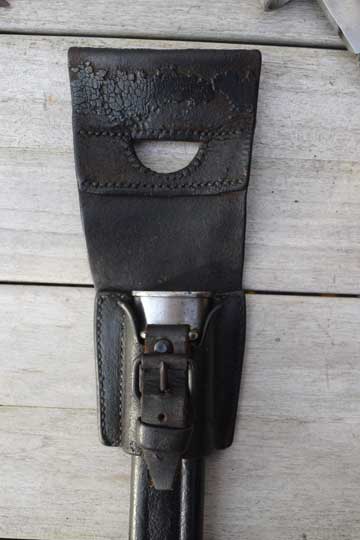 Excellent and correct early M 1878/M1887 black leather scabbard, all stitches intact. Bright finished metal fittings. Top mount is marked: 12 and the throat also unit marked: 86. Chape with 4 horizontal lines on the front.