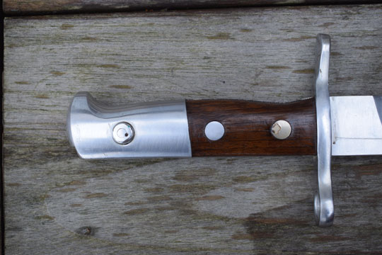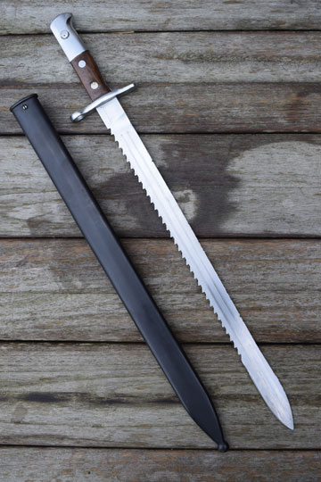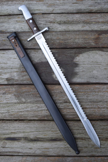 Schmidt-Rubin M 1911 Carbine. Serial number: 916076 on the crossguard. Excellent long bright finished 65 teeth sawback blade, swelled to the point and with a fuller on one side. The ricasso is marked with the Swiss maker's trademark: WAFFENFABRIK over NEUHAUSEN. Excellent+ Large bright finished pommel and crossguard. MRD 14 mm to fit M 1911 carbine. Short straight quillon marked with a o and a Swiss cross. Beautiful wooden grips riveted to tang with 2 large steel rivets.