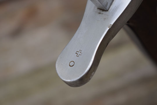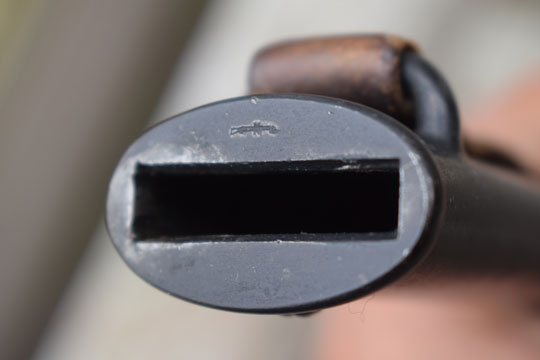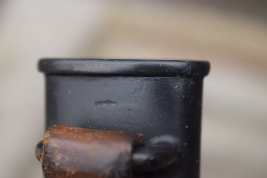 Excellent dark blued metal scabbard with no dents and a leather strap on the frog loop. Top of the scabbard and the throat are both marked with an automatic rifle stamp. A Swiss crossmark on the round ferule of the scabbard.