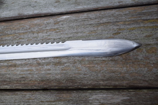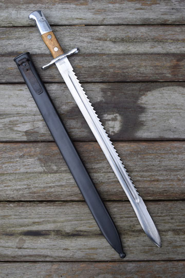 Schmidt-Rubin M 1911 Carbine. Serial number: 798785 on the crossguard . Minty long bright finished 65 sharp teeth sawback blade, swelled to the point and with fuller on one side. Ricasso marked with scarce Swiss maker's name: ELSENER over SCHWYZ on the ricasso. Large chromium plated pommel and crossguard. MRD 14 mm to fit M 1911 carbine. Working catch. Short straight quillon with a Swiss cross marking. Excellent light wooden grips riveted to tang with 2 large plated rivets.