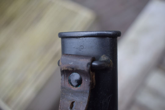 Excellent blued all steel scabbard. Intact leather strap. Ball final is marked with a Swiss cross. Scabbard top mount is marked with a large script P and the throat is marked with an automatic rifle stamp.