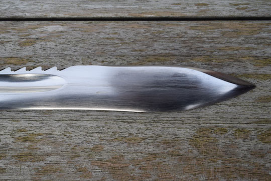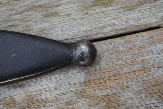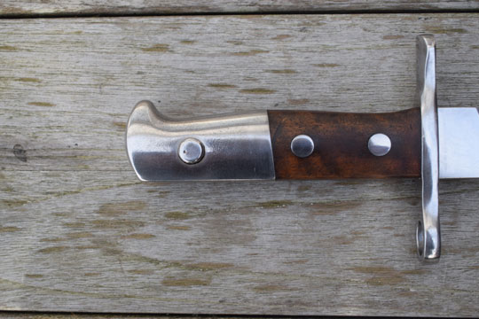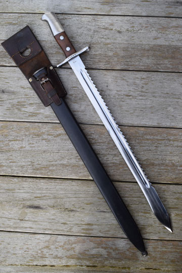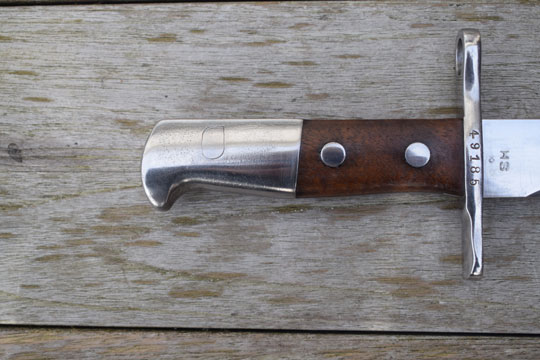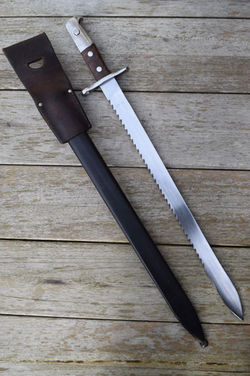 Schmidt-Rubin M 1911 Carbine. Serial number: 49185 on the crossguard. Superb long bright finished 65 teeth sawback blade, swelled to the point and with a fuller on one side. The ricasso is marked with the rare Swiss maker's trademark: H. S. (= HANS STEIMER - Wasen.) Large bright finished pommel and crossguard. MRD 14 mm to fit M 1911 carbine. Short straight quillon. Beautiful wooden grips riveted to tang with 2 large steel rivets.