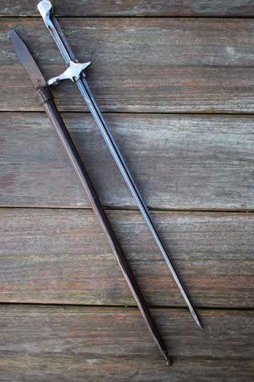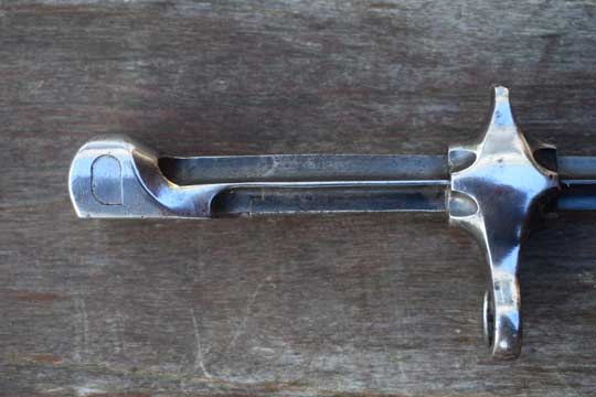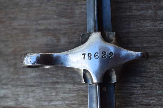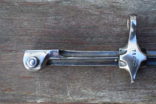 Schmidt-Rubin M 1889-1900 short rifle. Serial number 78622 on crossguard. Excellent blued cruciform blade, made from an old M 1863 Vertelli socked bayonet. Excellent crossguard with muzzle ring: MRD 14 mm and pommel with T-slot in mortise slot. Crossguard is marked with a Swiss Cross. Excellent brown leather scabbard with a brass finial. Frog retaining strap and stitches intact.