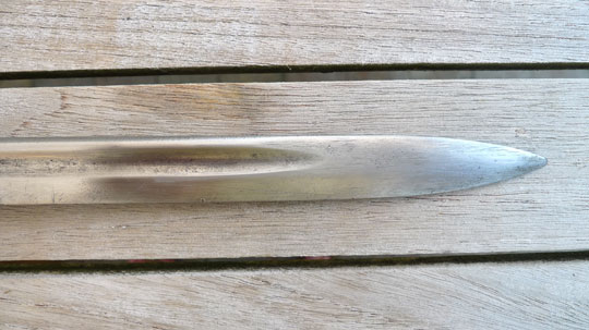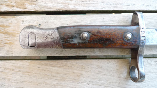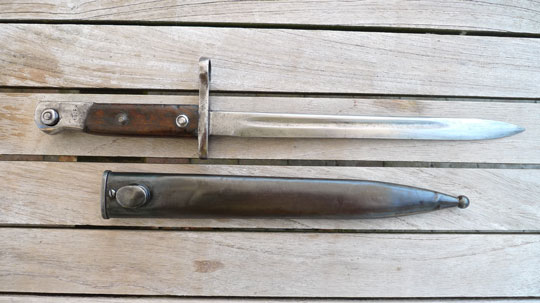 Turkish Mauser M 1890/1903 rifle. Serial number: 30136 on crossguard. Very good+ slim fullered bright finished blade, short made and not shortened! Very nice bright pommel marked AS.FA. Crossguard made without quillon but with muzzle ring. MRD 15.5 mm. T-slot in pommel. Very good wooden grips secured by two rivets to the blade tang. Correct blued scabbard with oval frog stud has small dent near tip only.