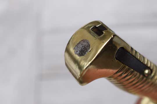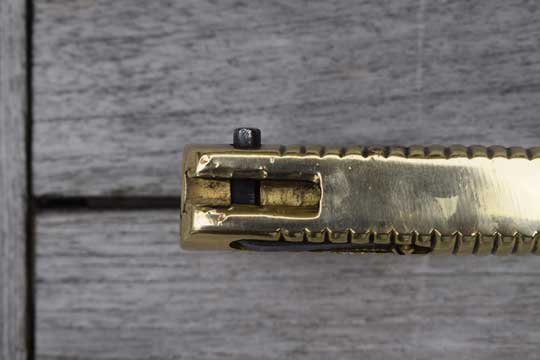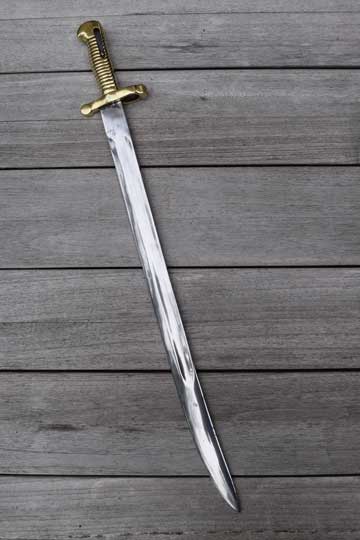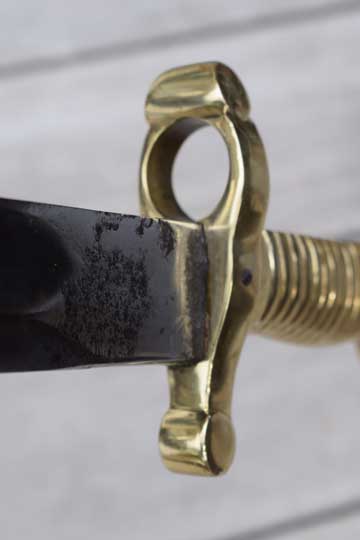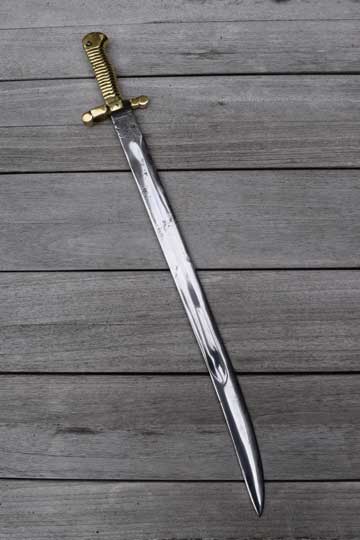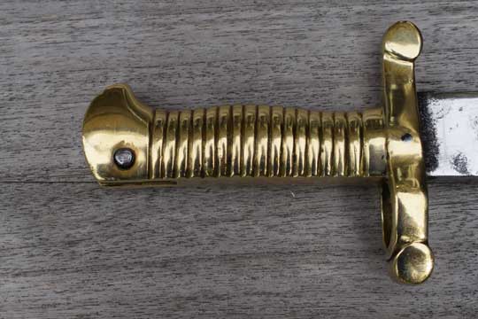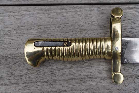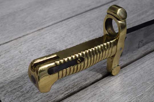 US M1855 Caliber .58 Springfield percussion rifle. REPLICA Very good+ impressive heavy bright finished fullered blade with an upward near the point. Model with rounded fullers. A few spots with light peppering on the left of the blade only. No markings to the ricasso. Excellent one piece cast brass hilt and crossguard with a muzzle ring and quillon, both with finials and secured to the tang by a smal steel rivet. MRD 22,5 mm. Grip with 17 ribs and a blued external spring fixed to the hilt by a steel screw.