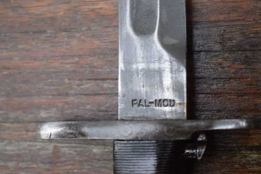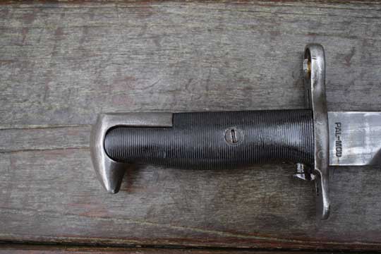 .30-06 M1903 Springfield/ M1 Garand. Excellent parkerized fullered shortened blade with rare US maker's trademark and date: O L (= Oneida Limited, New York) , U.- Flaming bomb- S., over 1943 very crisp on the ricasso. Spear pointed blade with false edge. Reverse side is marked: PAL-MOD This indicates that the conversion was done by PAL . Excellent parkerized pommel and crossguard. MRD 15,5 mm. Excellent black ribbed bakelite grips.