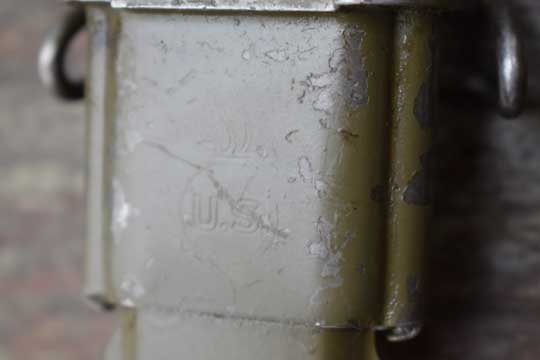 Olive drab painted M3 scabbard with a US belt hook. Top mount is marked: US in a Flaming bomb.