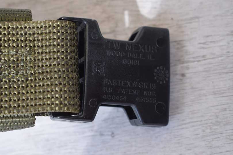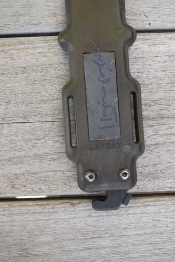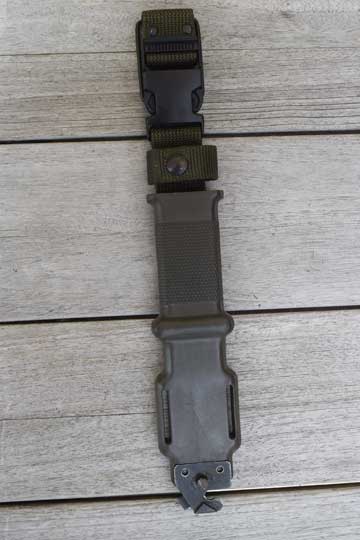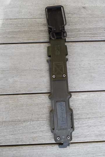 US M16 rifle, and variations. Minty US M9 scabbard only by LANCAY. Olive green plastic scabbard body wit a steel wire cutting device on the tip. Reverse side is checkered near the top. Reverse side is marked: LANCAY and there is a sharpening stone attached to the body. Integrated green nylon frog with a retaining strap and a black plastic buckle affixed to a blackened steel belt hook system. The buckle is marked : ITW NEXUS over WOOD DALE. IL. over 60191 over FASTEX#SR 1 1/2 over US PATEND NOS. over 4150464 4171555 and two markings,