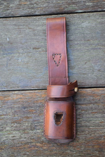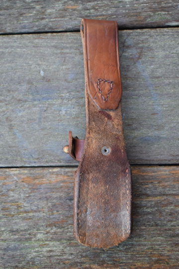 Excellent brown leather frog with brass rivet and retaining strap. Used for the Yugoslavian M 1924 and M 1948 Mauser bayonet. Typical Yugoslavian triangle stitching on the loop.