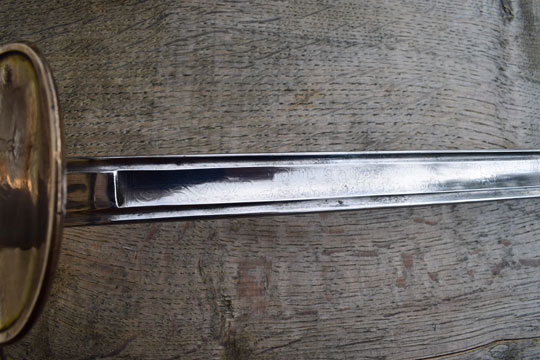 Spanish Infantry officers spadroon M 1822. Excellent long straight bright finished unusual blade with floral motives. No gilt and blue to the blade. Blade is marked: FABRICA D TOLEDO in large letters. The blade starts from the ricasso as a fullered blade and ended as a plain double edged blade. Beautiful fine ribbed single piece hard wood grip. Hilt with a brass urn shaped pommel and single hand guard with quillon with round crown shaped final. Brass folding clam shell crossguard. Folding clamp shell is a bit loose.