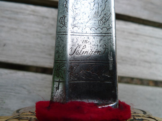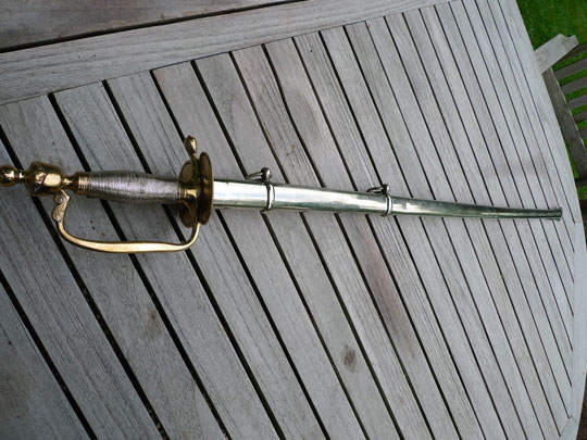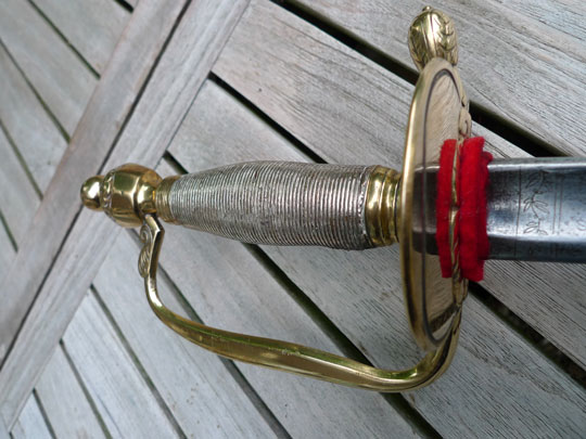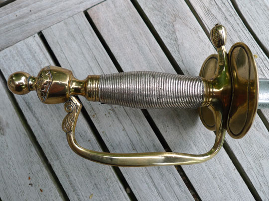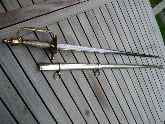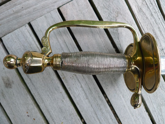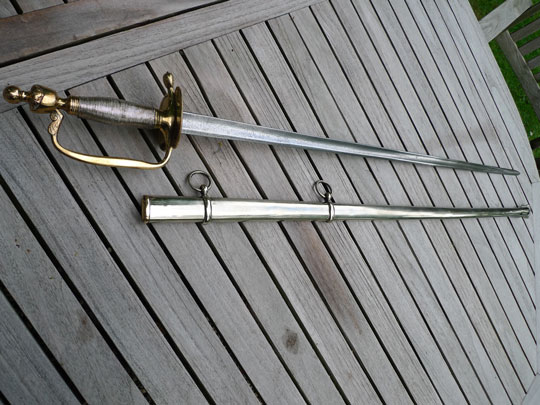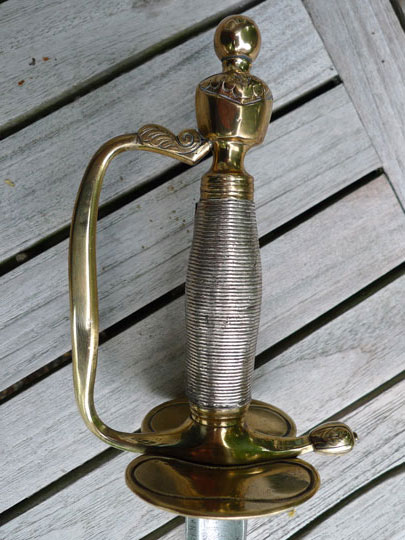 English 1796 Pattern Sergeant's sword used by the Royal Engineers. Excellent long straight bright single edged spadroon blade with very simple floral motives and German makers name A.S & Co on the one side and In SOLINGEN (= August Schnitzler in Solingen) on the reverse side. Beautiful plain brass handle with urn shaped pommel and single D shaped hand guard. Quillon with round crown shaped final. Silver foil sheet covered round single piece hilt with two small tears. Non folding clam shells. Excellent and rare all steel scabbard for mounted duty, as introduced in 1819 for the Royal Engineers. Two loose hanging rings and no dents.