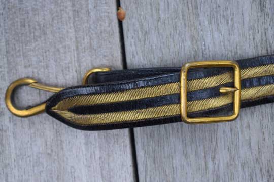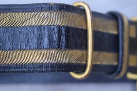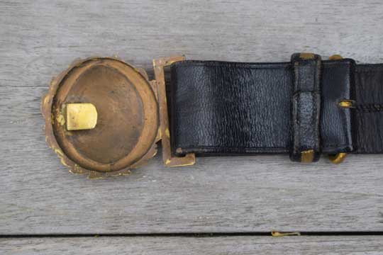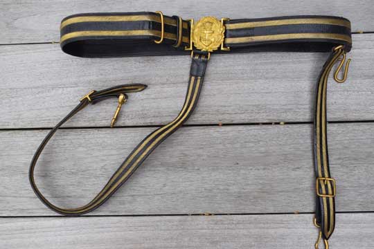 A beautiful and complete M 1827 ceremonial black leather sword belt with gold lining. It has two sword straps with gilt carbine hooks, a gilt sword hook and a large two parts gilt buckle showing a loose anchor in a laurel wrath.
