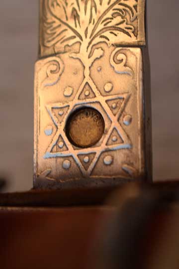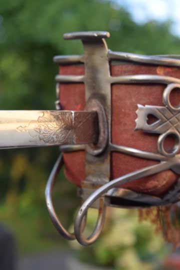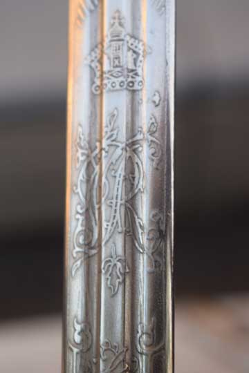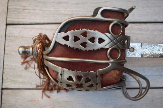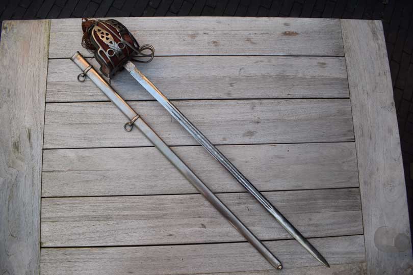 Scottish 1865 Pattern Highland Infantry Officers broadsword. Beautiful etched double fullered bright finished straight blade. Different deep etched on both sides with floral motives, a crest shield on the one side and the Royal Cypher of Queen Victoria (VR) on the reverse side. Both ricasso show the Star of David, the left one with a brass inlay in a circle, marked: Proved over T. Intact leather washer. Excellent very complex bright finished steel basket hilt (not plated!) with heart symboles and round hilt bars. Excellent buff leather hilt lining with a scarlet covering, blue silk edging and red/blue tassels on the bun type detachable pommel. Excellent skin covered round grip with an intact brass/silver twisted wire winding. The liner is somewhat discoulered over time and shows some light wear but no damage.
