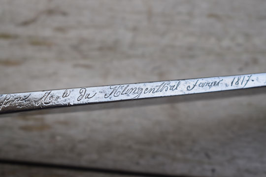 French M 1801 (An X) infantry troopers short sword. Excellent bright finished long plain blade with a few dings to the blade edge only. Blade spine is very crisp maker marked: Manufacture R'ale de Klingenthal, Janvier 1817. (= Royal factory of Klingenthal - Alsace January 1817). Intact leather washer. The left ricasso is crisp stamped with three French inspector stamps: Crown over K in a circle (= Director J. I. Krantz 1812-1816), B with in a wreth in a circle (= Inspector J.G. Bick 1793-1825) and L in a circle (= Revisor F. L. Lobstein 1804-1820).