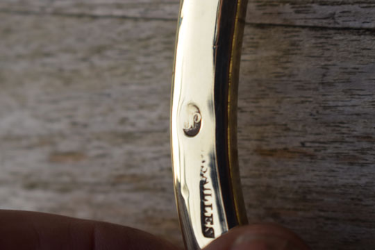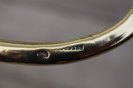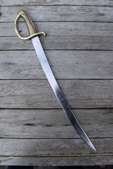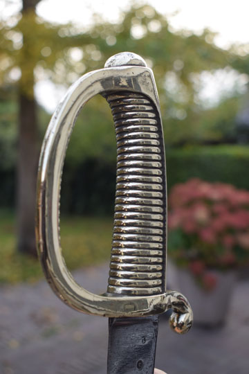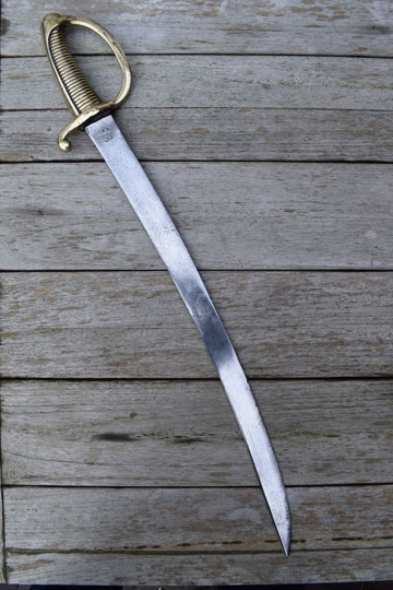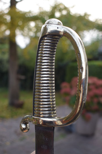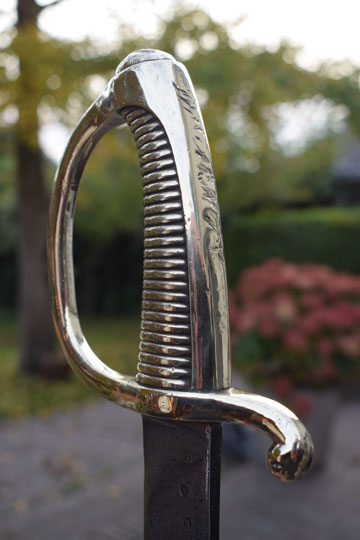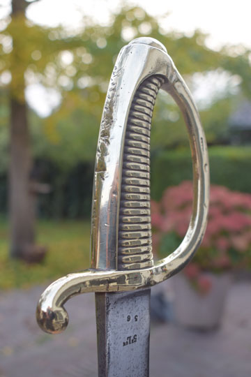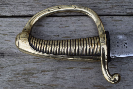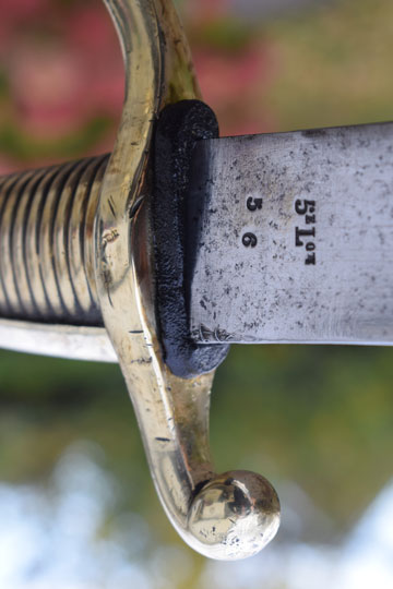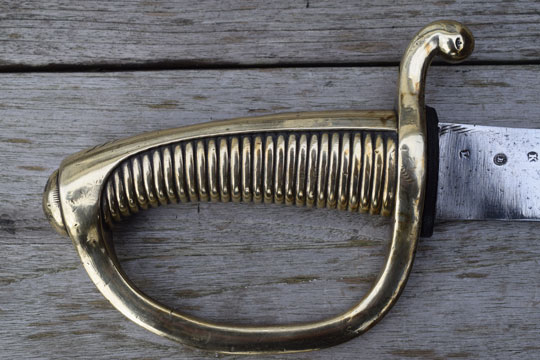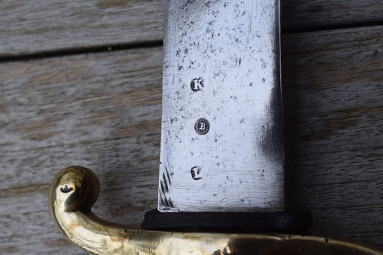 Excellent heavy one piece brass hilt with a single hand guard and a forward swept quillon. Grip with 28 fine ribs. Crosguard is B marked. back of the hilt shows some small indentations only. Left side of the hand guard is maker marked: VERSAILLES (= Versailles Arms Manufacture.- Director Nicolas Noel Boutet 1804- 1818 ) and shows two more French inspection markings: N and a *B marking.