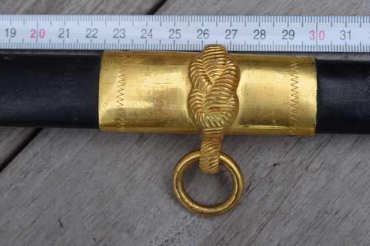 US M 1852 Naval officer sword scabbard only. A vintage M 1882 naval officers sword scabbard, Steel scabbard body covered with black leather and two gilt ring bands an gild dolphin chape.