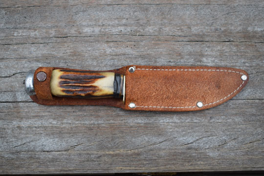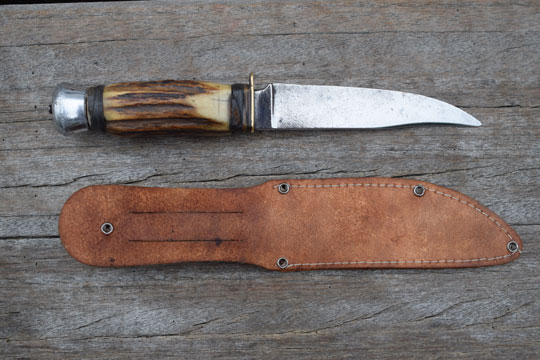 Vintage German hunter's knife made by JUL HERBERTZ, Solingen. Excellent plain Bowie style bright blade with false edge. German maker's name JUL HERBERTZ and SOLINGEN in two lines on ricasso. Detacheable hilt. Brass crossguard and round alloy pommel screwed on the blade tang. Detachable genuine one piece stag horn grip fit between leather washers. Excellent brown leather scabbard with all stitches intact.