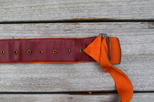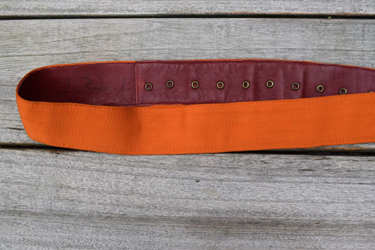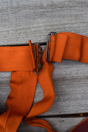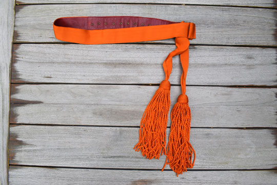 Adjustable orange canvas sash with two large orange tassels and a white metal buckle. Red leather reverse side.
