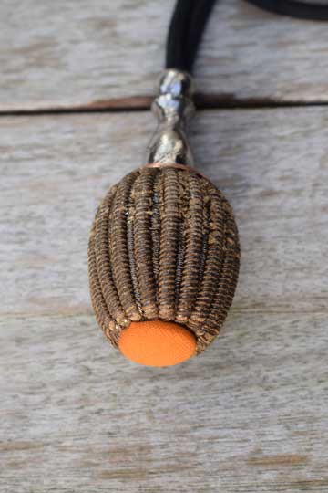 Nederlandse M 1855 infanterie officiers sabel kwast. / Dutch M 1855 infantry officers sword knot. Dutch infantry officers sword knot, for all models of Dutch officers swords from 1852 till present day. Carried by all officers swords of the infantry, cavalry, artillery, Jaegers, Grenadiers etc. From the rank of luitenant till General. Not used by the Marines and Navy. Acorn shape with plated steel stem and crown. Acorn head made out of multiple rows of bullion wire. Orange core and a black cord. Cord and acorn show light wear only.