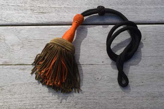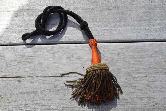 Nederlandse M 1855 infanterie Adjudant onderofficiers sabel kwast. / Dutch M 1855 infantry Senior NCO sword knot. Dutch infantry Senior NCO sword knot, for all models of Dutch swords and short swords from 1852. Carried by Senior NCO's of the infantry, cavalry, artillery, Jaegers, Grenadiers etc. Not used by the Marines and Navy. Orange stam, silver wire and orange core and a black cord.