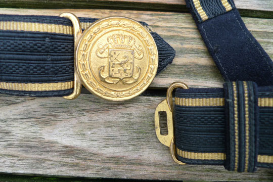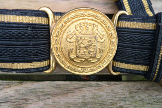 "Marine officier's ceremonieel sabeldraagstel voor "over de jas"/" Dutch naval officers ceremonial sword belt", over coat model. Excellent black fabric belt with gilt borders, fabric straps with gilt borders and a gilt brass hanging hook. A gilt brass round two piece buckle showing a Dutch rampant lion in a crowned shield over two loose anchors.